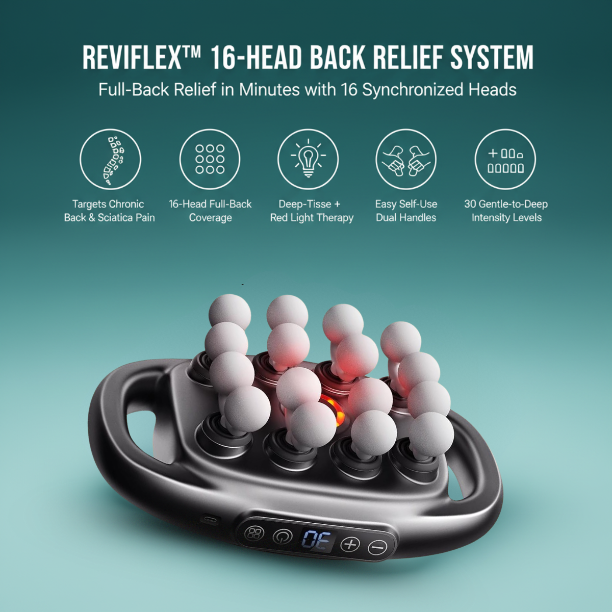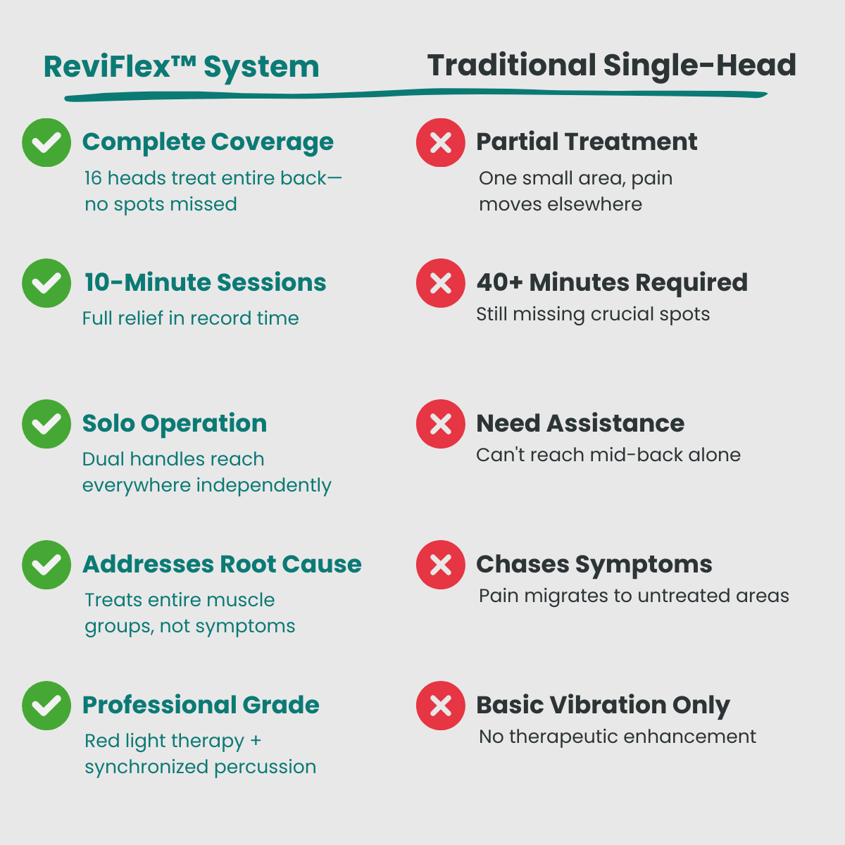 Transform your daily relief with ReviFlex™, the revolutionary 16-in-1 Synchronized Coverage System. Combining 16 synchronized massage heads, red light therapy, and 30 precision intensity levels, it redefines what's possible in at-home pain treatment. Users praise its ability to eliminate the 40-minute chase, restore complete mobility, and deliver true independence, making it a must-have for anyone who's tired of partial relief from single-head limitations. ReviFlex™ isn't just another massage gun; it's a commitment to complete coverage, restored self-sufficiency, and getting your whole back treated at once.