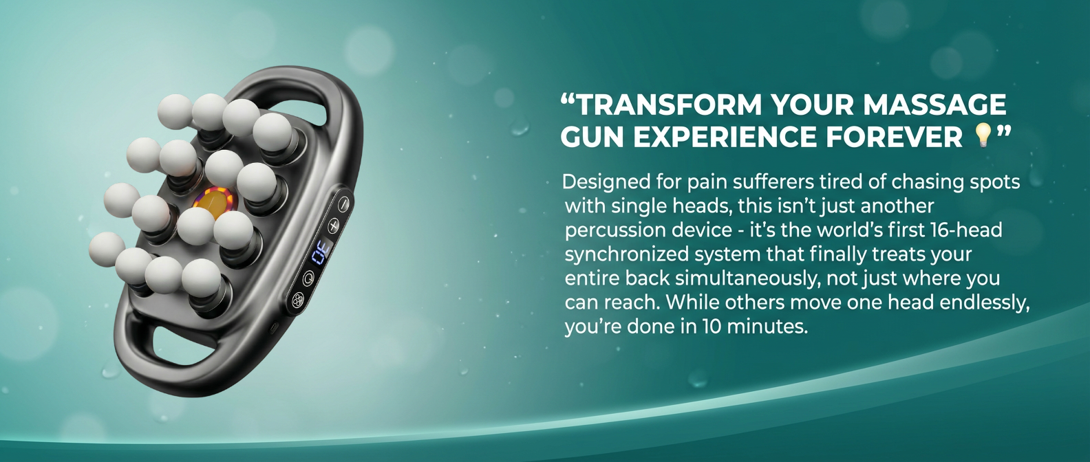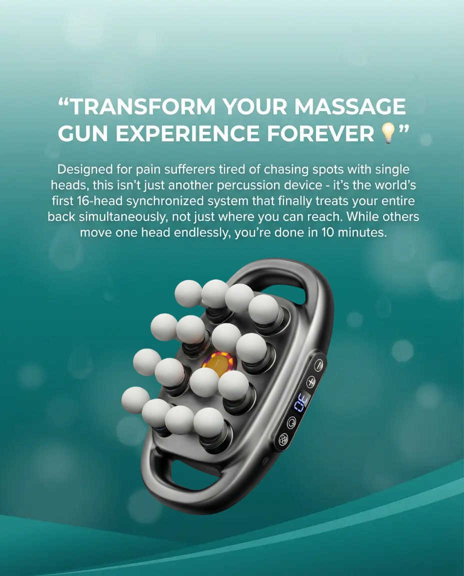 Experience the breakthrough 16-in-1 technology that's helping thousands escape single-spot limitations. This isn't just another massage gun—it's your personal massage team that covers your entire back in just 10 minutes.